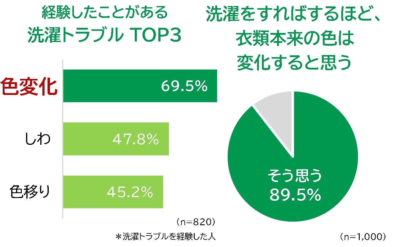 洗濯で最も多いトラブルは「色変化」で、洗濯トラブル経験者の約7割が経験していますが、「洗濯をすればするほど、衣類の色変化は起きてしまう」と考える人が多く、洗濯による、すなわち洗剤による洗浄と色変化防止は両立できないと諦めている実態も明らかになりました。しかし、新型コロナウイルス感染症の影響が落ち着き外出機会が増える中、恋愛やビジネスシーンにおいて色変化をした衣類がネガティブな印象を与えることや、サステナブルファッションの広まりを背景に、色変化を防ぎ、衣類のロングライフ化を実現する新しい衣料用洗剤が求められていることも明らかになっています。 本調査の主な結果は以下の通りです。