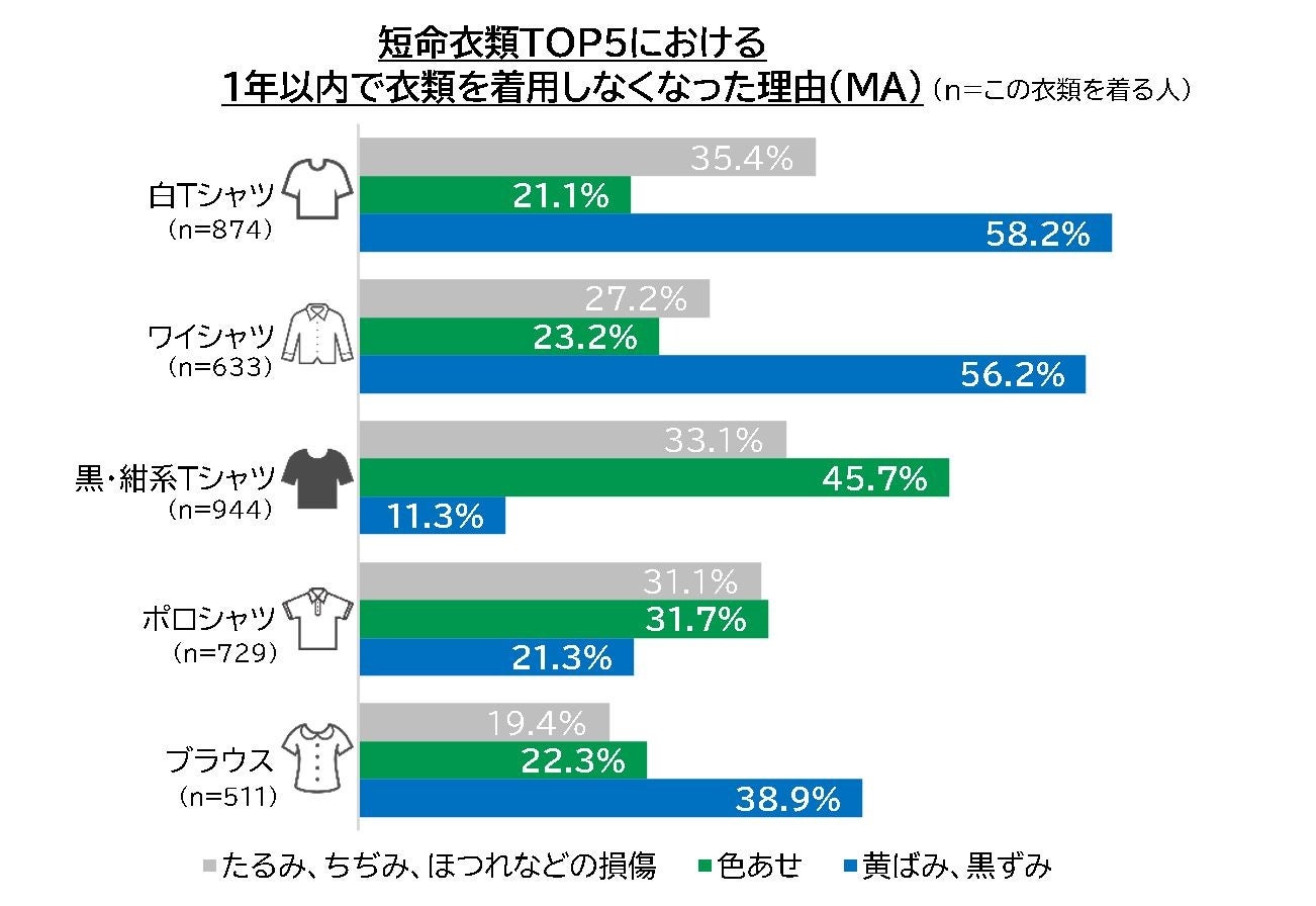 さらに短命衣類の上位5項目に絞ってみると、いずれも「たるみ、ちぢみ、ほつれなどの損傷」よりも「色変化」に当たる項目が上回り、白Tシャツやワイシャツは、約6割の人が「黄ばみ、黒ずみ」を、黒・紺系Tシャツは、約5割の人が「色あせ」を理由としています。