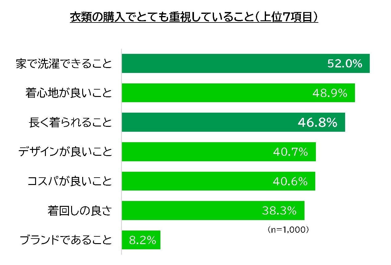 衣類購入時において、「とても重視している」と回答した割合が高い項目は、トップが「家で洗濯できること」(52.0%)で、3番目に「長く着られること」(46.8%)が入り、「デザインが良いこと」(40.7%)や「コスパが良いこと」(40.6%)を上回っています。