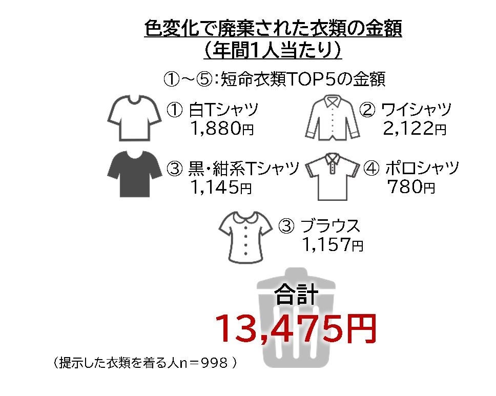 本調査では、衣類の種別ごとに1年間で色変化を理由に廃棄した枚数と、購入時の平均的金額を尋ね、1人当たりの廃棄している衣類の金額を割り出しました。その結果、 1人当たり年間13,475円分の衣類が色変化によって廃棄されていることが明らかになりました。