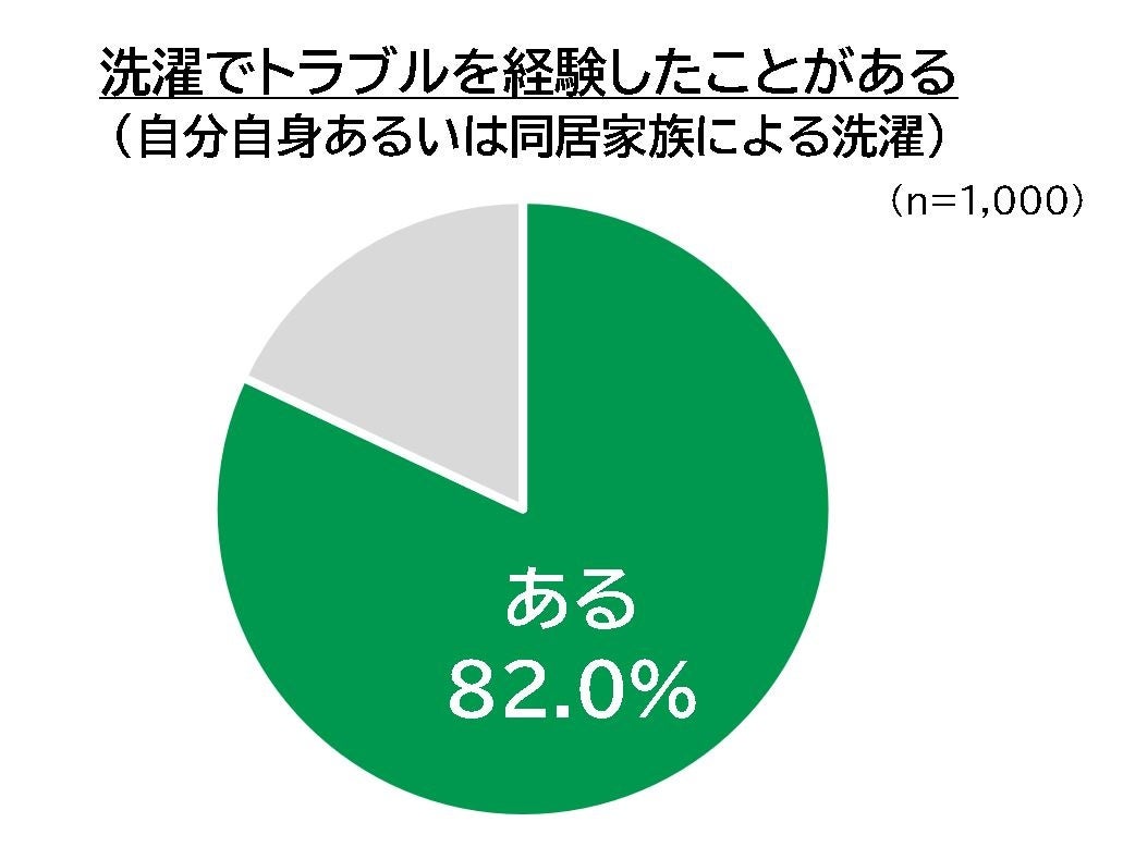 自分自身あるいは同居家族が洗濯をしたことで洗濯トラブルが起きた経験の有無について尋ねたところ、約8割の人が洗濯トラブルを経験していました。日々の生活に欠かせない洗濯ですが、正しい洗濯方法を学ぶ機会も少ないことから、トラブルが起きやすい家事なのかもしれません。