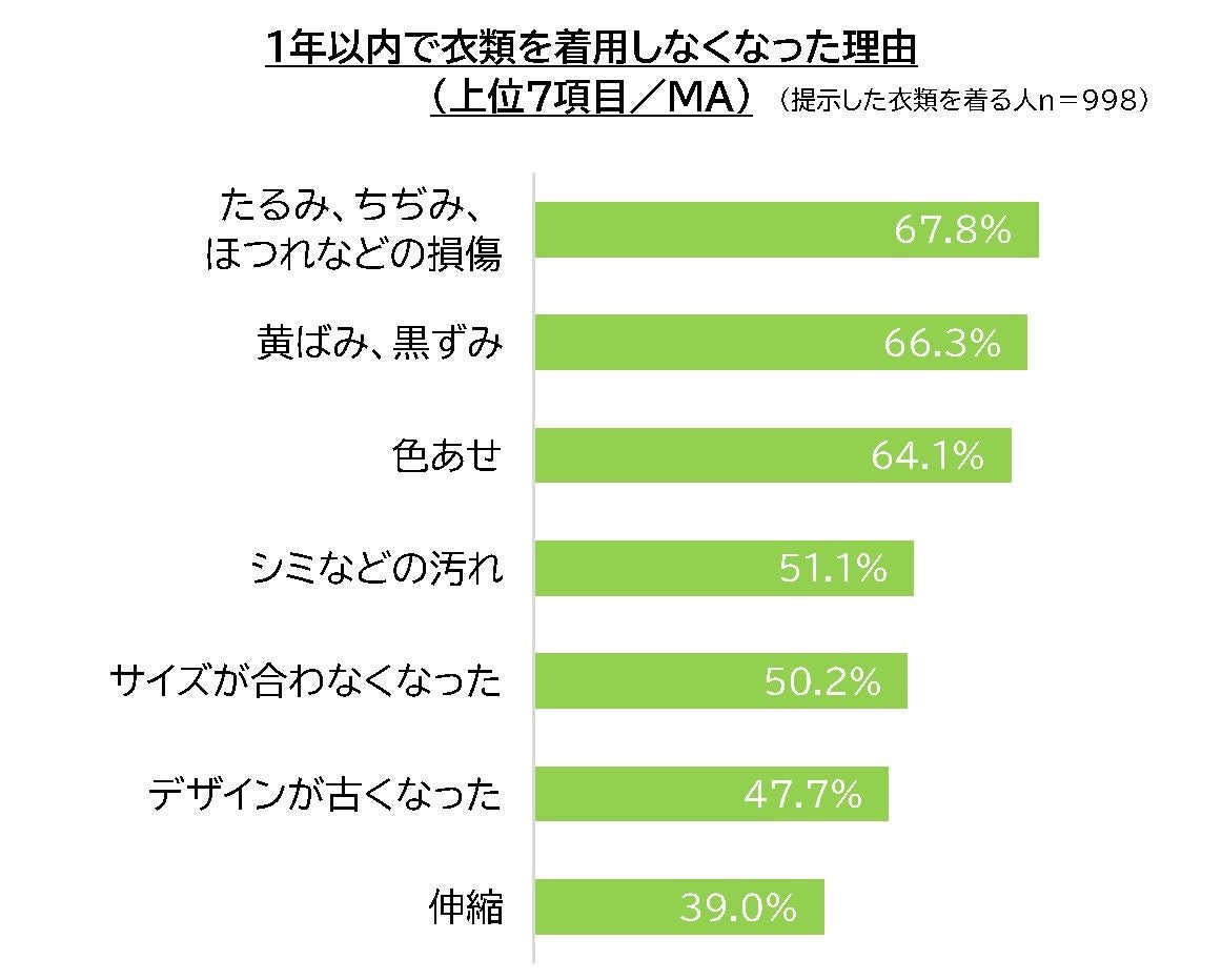 服を着なくなった理由について尋ねたところ、「たるみ、ちぢみ、ほつれなどの損傷」に次いで、「黄ばみ・黒ずみ」「色あせ」といった「色変化」が多い結果となりました。