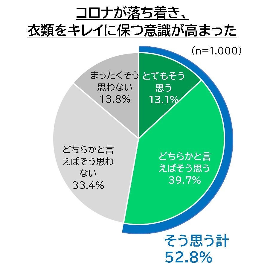 新型コロナウイルス感染症の感染症法上の位置付けが5類に移行し、外出機会も増える中、半数以上(52.8%)の人が、「コロナが落ち着き、衣類をキレイに保つ意識が高まった」と回答しました。