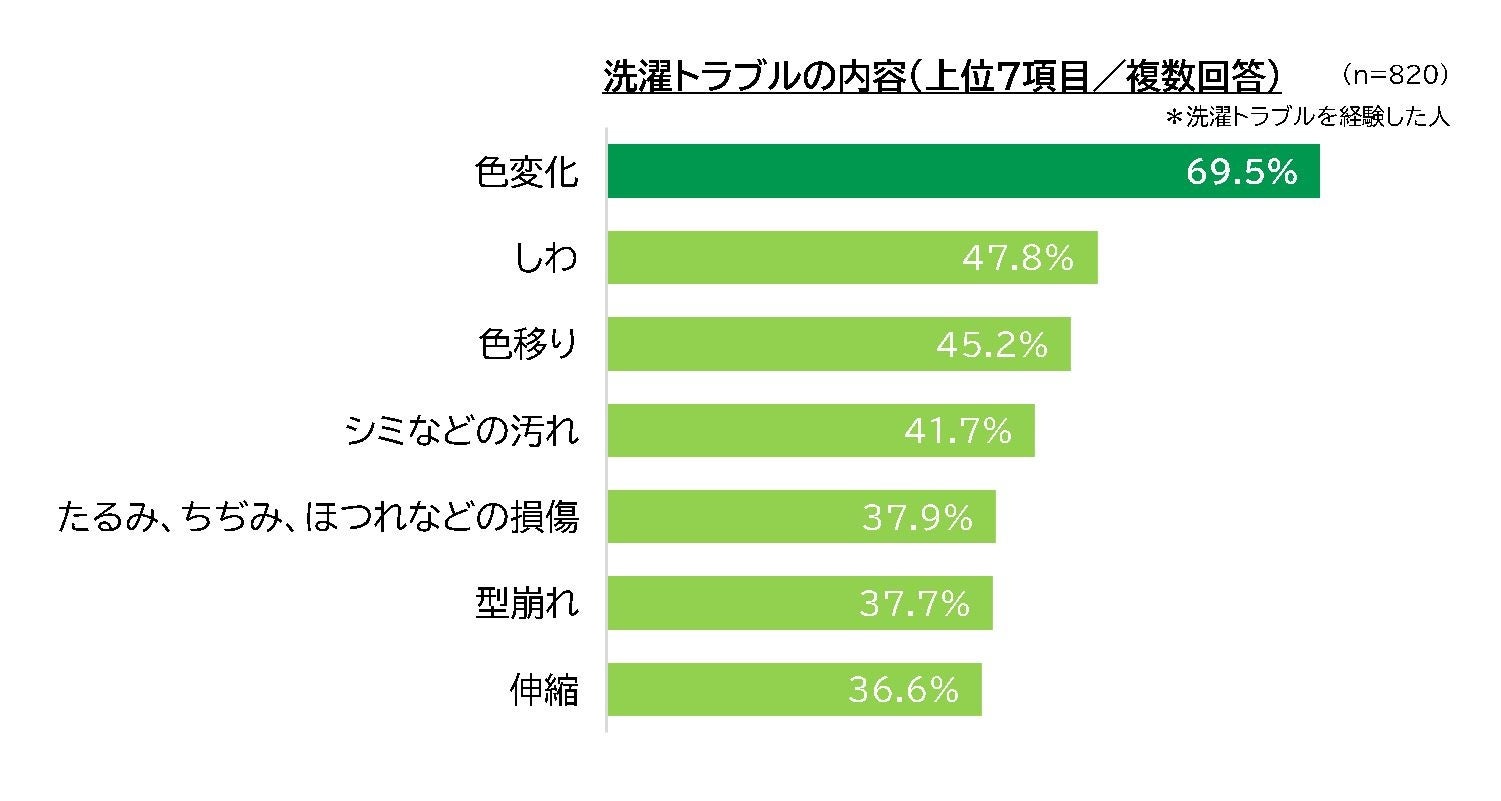 トラブルを経験した人にその内容について尋ねたところ、「色変化」に関するトラブルを約7割の人が経験し、最も多い洗濯トラブルという結果になりました。
