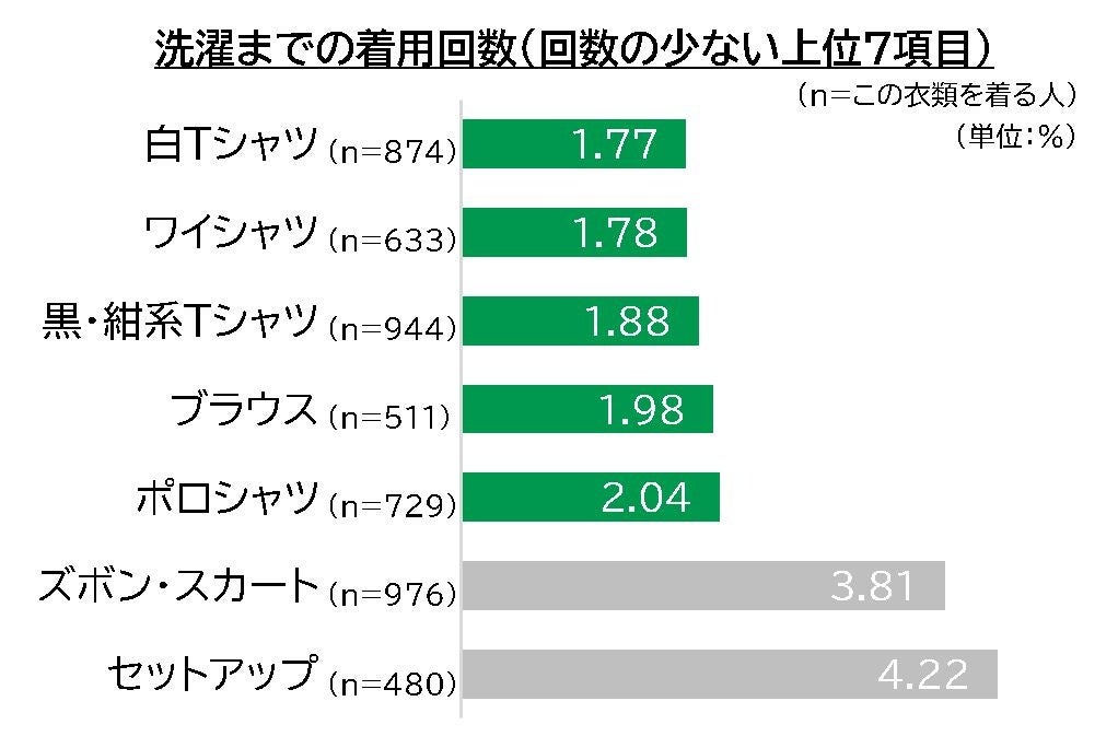 その結果、平均寿命が短い衣類TOP5(2ページ参照)は着用回数約2回以下で洗濯していることがわかり、洗濯の頻度が多いほど衣類は短命になることが明らかになりました。
