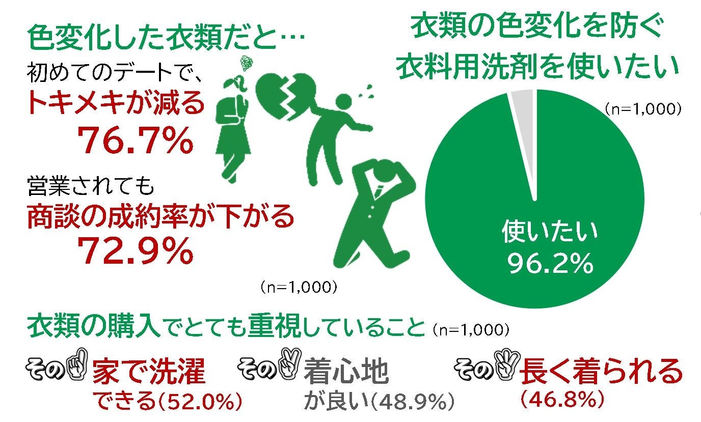 恋愛・ビジネスにおいて、衣類の「色変化」が印象を左右することも判明 サステナブルファッションの広まりも背景に、「落とす」と「保つ」の両立を実現する新しい衣料用洗剤にニーズ