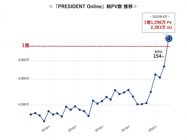 株式会社プレジデント社(本社:東京都千代田区平河町2-16-1 社長:長坂嘉昭)は、「プレジデントオンライン」( https://president.jp/ )の2020年4月の純ページビュー(PV)が1億1296万PV、ユニークユーザー(UU)が2383万UUとなったことをお知らせします。