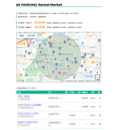 本サービスは、対象地点住所を入力すると半径2km範囲以内における月極駐⾞場の賃料相場を【平置き】【機械式】のそれぞれで自動算出するものであり、管理会社様は最新の相場賃料情報を参考にしながら値付けを行うことが可能となります。また、番地によるピンポイント住所での賃料相場算出機能サービスは月極駐車場業界で初となります。