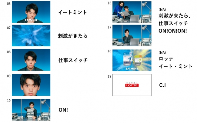「EATMINT」は、ガツンとした清涼感を味わえる、ガムでもタブレットでもない“新感覚ミント”です。この度、2017年の発売時からのCMキャラクターである俳優の竹内涼真さんを継続して起用し新CMを制作しました。仕事のやる気が出ない様子の竹内さんが「EATMINT」を食べた瞬間、「仕事スイッチON!」状態になり、キリッとした表情に一変、テキパキと仕事をこなしていきます。刺激的な爽快感で、ビジネスマンの仕事スイッチをON!する「EATMINT」のコンセプトを表現しました。