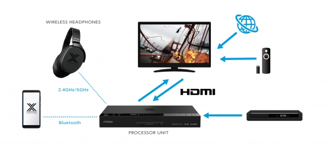 プロセッサー部とヘッドホン部間は2.4/5GHz帯デュアルバンドのデジタルワイヤレス伝送を採用。周囲の環境に合わせて音が途切れにくい伝送帯域を自動選択します。
