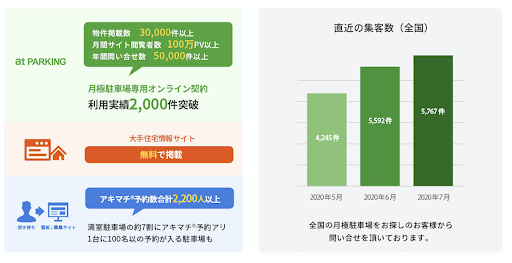 2020年7月3日には、オンライン契約に特化した国内最大級の月極駐車場探しサイト「at PARKING online」が完成し、同サイトにも自動掲載されることで、駐車場ユーザーはこれまで以上に月極駐車場が探しやすく、契約しやすくなります。