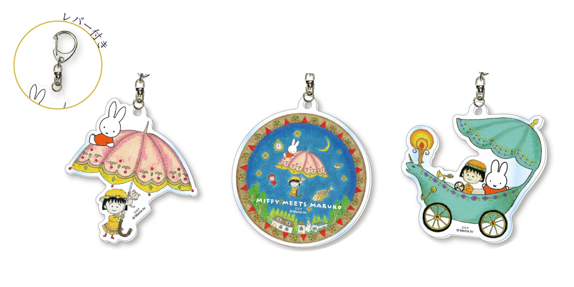 ◆アクリルキーホルダー miffy meets maruko (左から)ダイカットアンブレラ柄/アンブレラ柄/乳母車柄 各715円(税込)