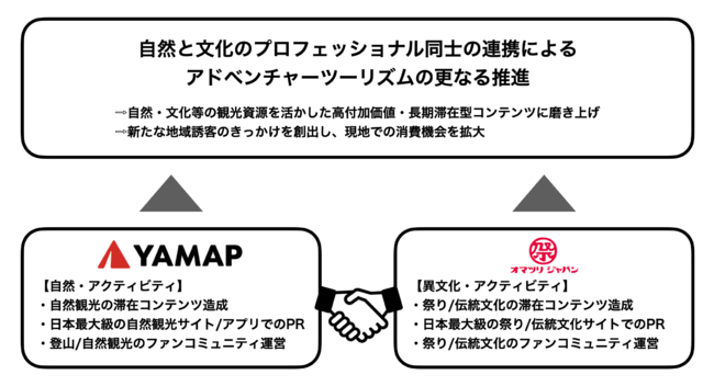 自然・アウトドア分野に強みをもつヤマップと、祭り・伝統文化に強みをもつオマツリジャパンとが連携をすることで、観光庁がポストコロナ観光政策の注力分野に位置づけている「アドベンチャーツーリズム」を推進し、来たるインバウンド需要回復期に向けて、国内のみならず海外の観光客を惹きつける高付加価値かつ長期滞在型の観光コンテンツを提供いたします。