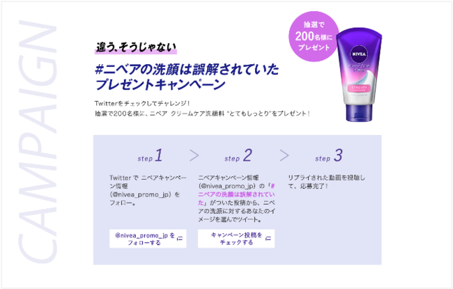 Twitter でニベアキャンペーン情報 (@nivea_promo_jp) をフォローして、 #ニベアは違うそうじゃない がついた投稿から、あなたのニベアの洗顔に対するイメージを選んでツイートしてください。リプライされた動画を見てくれた方の中から、抽選で計200名様にニベア クリームケア洗顔料 ”とてもしっとり” 現品1本をプレゼント!