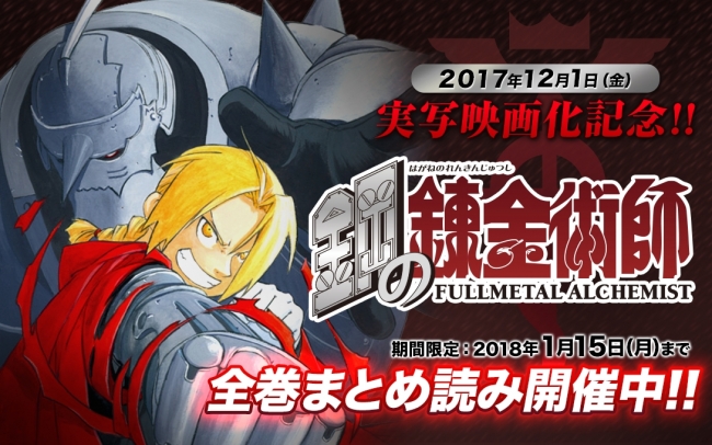 2017年12月1日から実写版映画が公開されることで話題の「鋼の錬金術師」を期間限定で全話を一挙公開中です。(2018年1月15日まで)