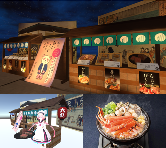 「バーチャル大丸・松坂屋」には、年末年始のごちそうグルメがずらりと並びました。カニ鍋やローストビーフ、グラタン、アイス、ワインなど厳選8アイテムの、今シーズンならではの特別なグルメがその場で購入可能なブースを展開。リアル食品の販売はバーチャルマーケットで初の試みとなりました。さらに、大丸松坂屋百貨店公式キャラクター「さくらパンダ」の3Dモデルを無料配布。なお、店舗は老舗ならではの演出として、大丸松坂屋百貨店の江戸時代の資料を使用し、浮世絵の店舗画を背景とした屋台風のものが人気となりました。