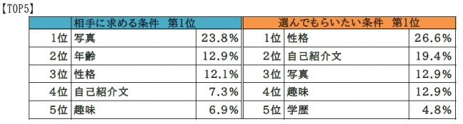 相手に求める条件としては外見(写真)、選んでもらいたい条件としては内面(性格)が最も多い結果となり、現実社会とあまり変わらないように感じました。一方、「自己紹介文」というのはマッチングアプリならではだと思います。選んでもらいたい条件として5位にランクインしている「学歴」ですが、相手に求める条件として1位に選ぶ人は「血液型」の次に少なく、学歴社会と言われている反面、個人にとってはあまり重要ではないようです。