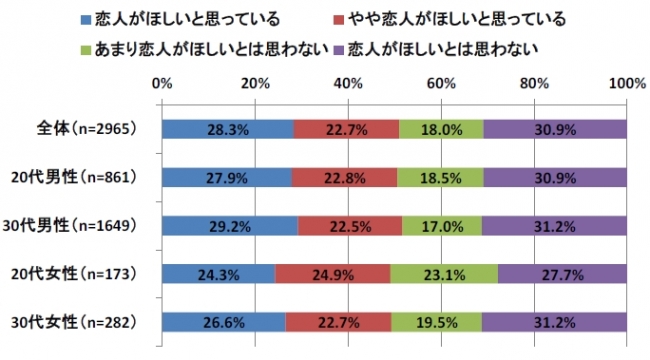 多く感じるか少なく感じるかは人それぞれだと思いますが、現在恋人がいない20代30代の中では、48.9%の人が「あまり恋人がほしいとは思わない」「恋人がほしいとは思わない」と思っているようです。「若者の恋愛離れ」などの言葉を頻繁に耳にした時期もありましたが、恋人がほしいと思わないと言える人が一定数いることは良いことだと感じます。