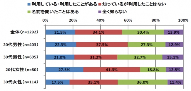 現在、女性無料・男性有料の料金システムを採っているアプリが多いため、利用率の男女差があまりないというのは、予想通りの結果でした。認知度の違いは、広告・プロモーションの量を反映していると捉えると、若い女性の利用者を増やしたい、という企業の意図を読み取ることができます。また、恋人がほしいと回答した人の中でも「全く知らない」という人が1割以上いることから、今後の動向次第でさらに普及が進む余地があるといえます。