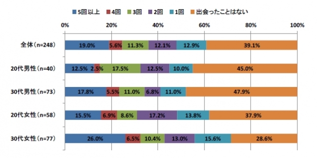 特に30代女性の「5回以上」会った人の割合は他の性年代より高く、「出会ったことはない」の割合は低くなっています。