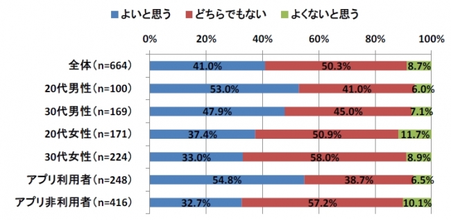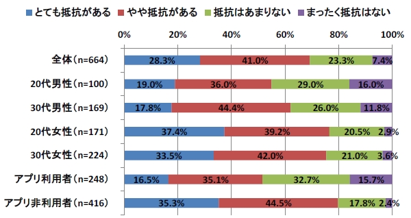 男性よりも女性、アプリの利用者よりも非利用者のほうが抵抗を感じている、というのは想像通りの結果となりました。また、アプリ利用者においても過半数の人が少なからず抵抗感を持っていることに着目すると、マッチングアプリに対する負の社会的イメージが存在していることが推定されます。しかし同時に、アプリ利用者の満足度を上げることができる可能性があるとも言えます。