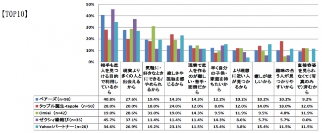 全体として「相手も恋人を見つける目的で利用しているから」、「現実より多くの人と出会えるから」が多いものの、利用する目的によって選ぶアプリが異なることが推定でき、真剣に相手を探している人と、気軽さを求める人に二分化しているのではないかと考えました。Q4の結果と合わせると、20代女性の利用者が多い「タップル誕生‐tapple」では、寂しさや孤独を埋めるため、趣味が合う人を見つけるためなどの割合が比較的高いことがわかりました。