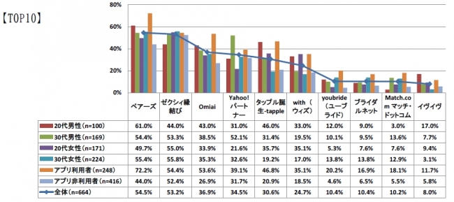 マッチングアプリの認知度は性別や年代によって異なっているものの、「ゼクシィ縁結び」に関しては、アプリの利用者と非利用者間で認知度にあまり差がないことが驚きでした。一方、「Yahoo!パートナー」と「with」では、20代と30代で逆の結果を示していることなどから、これらのアプリは明確にターゲットとしている層があることがわかります。