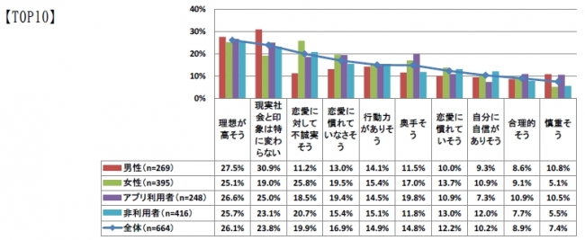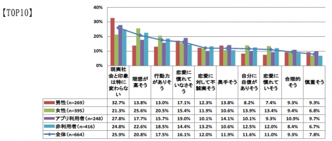 同性について質問したときとは順位が入れ替わる結果となり、マッチングアプリを利用している男性に対して「恋愛に対して不誠実そう」という印象を持っている女性が多いことがわかりました。TOP10に対立する印象(「恋愛に慣れていそう」と「恋愛に慣れていなさそう」など)がランクインしている中、「理想が高そう」に対して「理想が低そう」が入っていないことも含め、男女問わず、マッチングアプリを利用している人(特に女性)は「理想が高そう」という印象が強いことがわかりました。