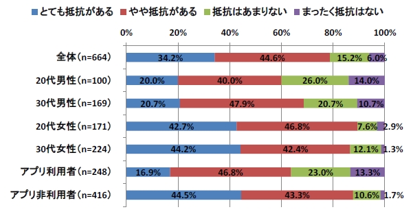20代男性は抵抗を感じている人が最も少なかった一方、20代女性では、89.5%の人が「とても抵抗がある」「やや抵抗感がある」と回答しており、若い世代での安全面に対する意識の差は顕著です。スマートフォンを通じたSNSでのやりとりは当たり前になっているものの、マッチングアプリでは知り合った相手と直接会う場合があるため、安全面での抵抗感に繋がっていると考えます。
