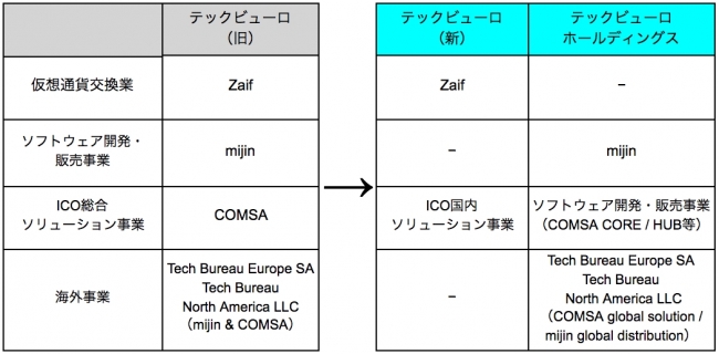 ICO総合プラットフォーム「COMSA」事業につきましては、分社化に合わせ国内ソリューション事業とソフトウェア事業とに分割し、ソフトウェア事業をテックビューロホールティングスに承継いたします。分社化後は、テックビューロホールティングスにおいて、 COMSA CORE・HUB等のソフトウェア開発に同社の資源を集中することで、ICO総合プラットフォームの実現に向けた準備を推進して参ります。