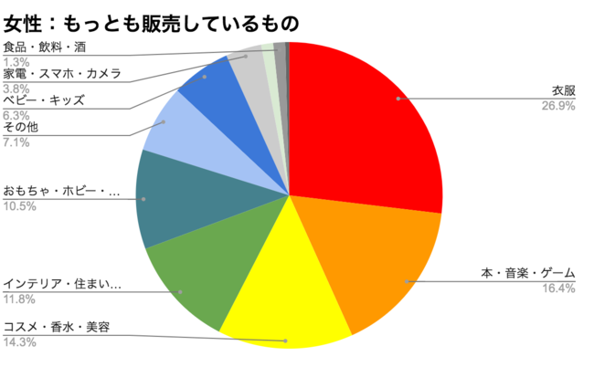 女性の回答者では、1位 衣服(26.9%)、2位 本・音楽・ゲーム(16.4%)、3位 コスメ・香水・美容 (14.3%)でした。