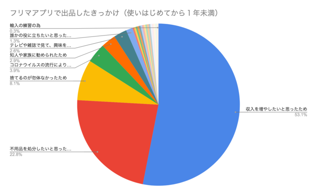 また、フリマアプリを使いはじめてから1年未満の方に、出品したきっかけを聞いたところ、全体の半数が「収入を増やしたいと思ったため」 (53.1%)と回答。
