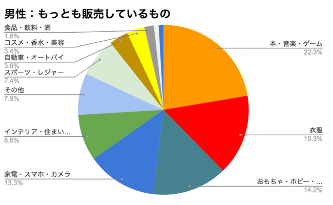 男性の回答者では、1位 本・音楽・ゲーム(22.3%)、2位 衣服(15.3%)、3位 おもちゃ・ホビー・グッズ(14.2%)でした。