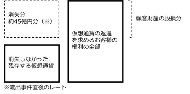 しかしながら、この度の流出事件により、事件当時のレートで約45億円分の仮想通貨が消失しました。お客様の全員が「仮想通貨の返還を求める権利」を行使された場合、弊社は当時のレートでは返還義務を果たすために約45億円の仮想通貨が足りない状態に陥っていました。