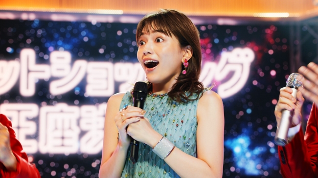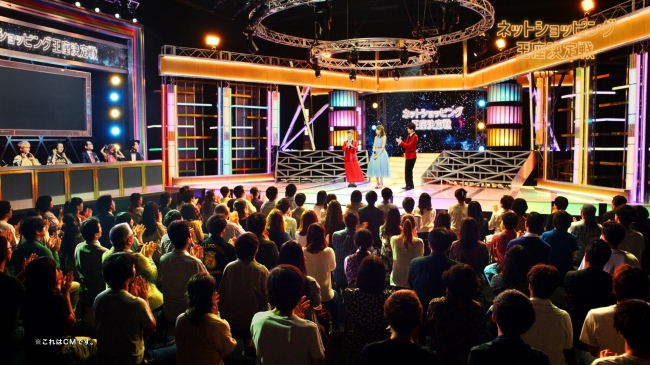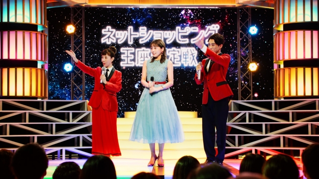 「ネットショッピング王座決定戦」で歌い終え、結果を待つ川口さん。司会の戸田さんによる「それでは得点をどうぞ!」の声が響き渡ると同時に、審査員の採点が発表される。