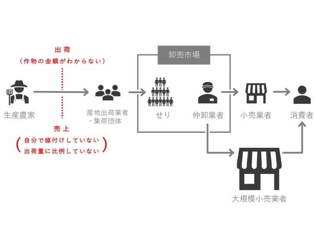 現在、多くの農家さんにとって一般的な出荷先である「市場(しじょう)」出荷の場合、農家さんが作った作物は、お店に並ぶまでに一箇所でまとめられ、農家さんの目に見えないところで金額が決められる仕組みになっています。