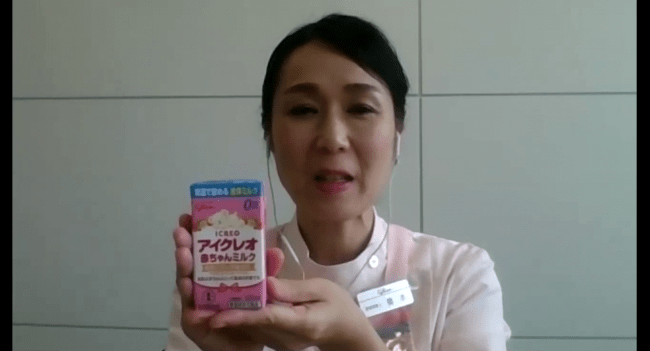 6月21日(日)の オンラインセミナーには、妊娠中・授乳育児中のご家庭9組が全国から参加しました。セミナーは3部から構成され、第一部では、液体ミルク「アイクレオ 赤ちゃんミルク」の商品開発者であり、3児の父でもある江崎グリコの永富宏が、パパにとって液体ミルクを活用するメリットや「アイクレオ 赤ちゃんミルク」の安全性やおいしさの秘密などについて紹介しました。次の第二部では、子育てアドバイザーで管理栄養士でもある江崎グリコの奥本佳代より、液体ミルクを使った授乳体験会が行われました。最後の第三部では、パパやママから育児に関する質問に答える育児相談会を行い、「パパだと赤ちゃんがミルクを飲んでくれない」「夫婦円満の秘訣」などの相談や、「テレワーク時にこそ赤ちゃんミルクが活躍する」といった液体ミルクの使い時について、登壇した永富と奥本が回答しました。