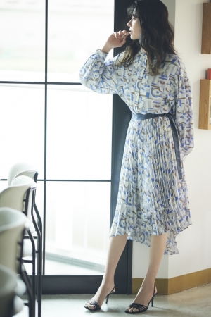【写真:トップス:オリジナルプリントボリュームスリーブブラウス(ブループリント)、ボトムス:オリジナルプリントプリーツラップスカート(ブループリント)】
