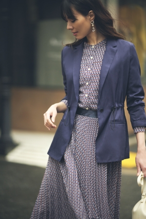 【写真:アウター:麻混ウエストドーローコードデザインジャケット(ネイビー)トップス:オリジナルプリントボリュームスリーブブラウス(ネイビープリント)ボトムス:オリジナルプリントプリーツラップスカート(ネイビープリント)】
