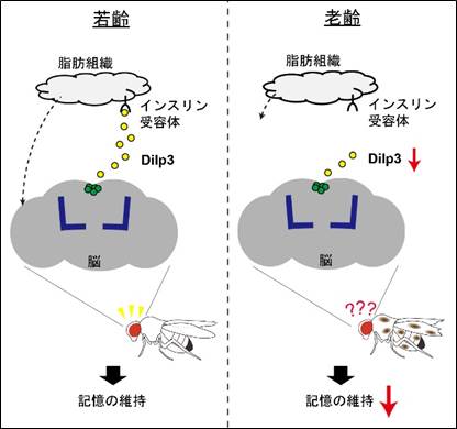 また、インスリン受容体は筋肉、脂肪組織や神経細胞など様々な組織に発現していますが、その中でも脂肪組織におけるインスリン受容体の発現が記憶の維持に必要であることが分かりました。ショウジョウバエでは、インスリンとインスリンによく似たインスリン様成長因子(IGF)の機能は、Dilp1から Dilp8まで8種でまかなわれており、機能分担しています。本研究により、このうち特にDilp3が記憶の維持に必要であることが明らかとなりました。このDilp3の発現は 老化にともなって特異的に低下することから、老化したショウジョウバエにDilp3を過剰に発現させたとこ ろ記憶が向上することが分かりました。これらのことから、若いショウジョウバエではDilp3と脂肪組織に おけるインスリンシグナルの活性化によって記憶が維持される一方で、老化したショウジョウバエでは Dilp3の発現が低下することで記憶低下が引き起こされていることが明らかになりました(図)。