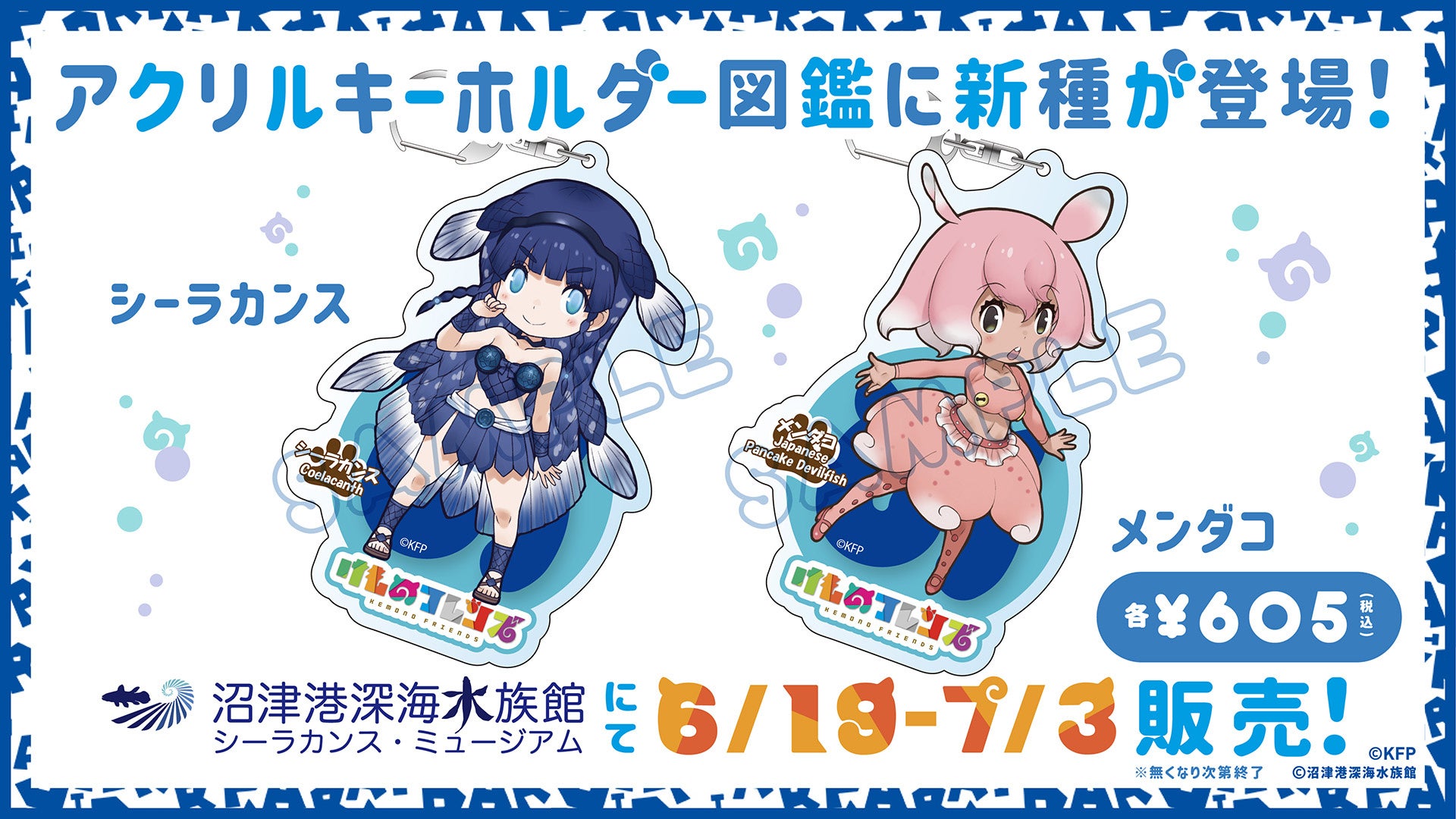 そして、今回のコラボを記念して、けものフレンズより新たに「シーラカンス」と「メンダコ」のフレンズが登場。「シーラカンス」は生きる化石とも言われる深海魚で、「メンダコ」は深海に住む手乗りサイズのタコの仲間。コラボ企画開催中、新グッズとして新フレンズ2種の「アクリルキーホルダー図鑑」を販売する。