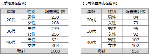 ■調査対象:愛知県在住の20~49歳の男女。平成27年国勢調査の構成に合わせて、愛知県・名古屋市 ×性別×年代で以下のように割付けた。