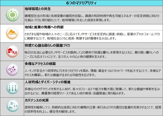 住友商事グループは『社会とともに持続的に成長するための6つのマテリアリティ(重要課題)』を、事業戦略の策定や個々のビジネスの意思決定プロセスにおける重要な要素と位置付け、事業活動を通じて課題を解決することで持続的な成長を図っていきます。本事業は、特に「地域と産業の発展への貢献」に資する事業です。