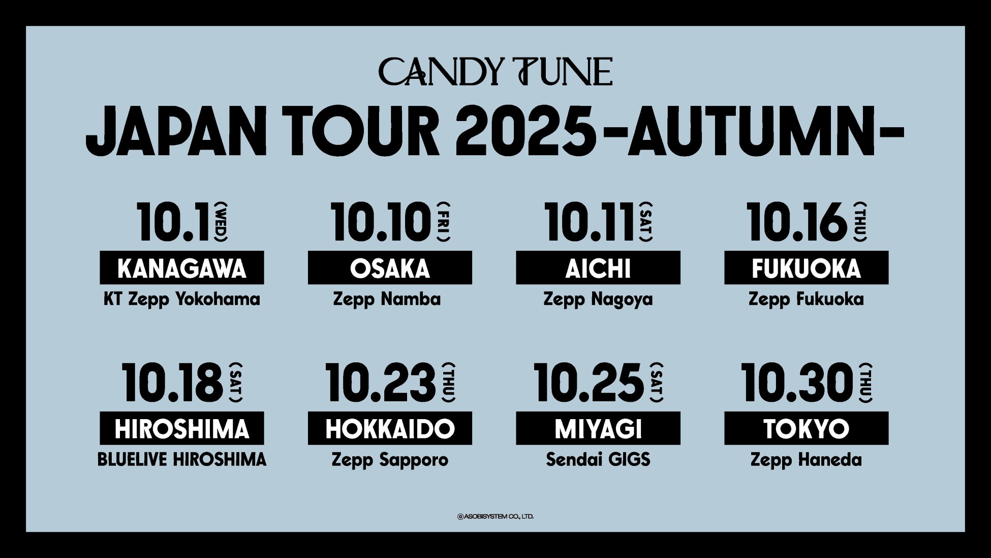 ツアーは10月1日(水)の神奈川・KT Zepp Yokohamaでの公演を皮切りに、大阪・Zepp Namba (OSAKA)、愛知・Zepp Nagoya、福岡・Zepp Fukuoka、広島・BLUELIVE HIROSHIMA、北海道・Zepp Sapporo、宮城・仙台GIGS、東京・Zepp Hanedaまで、全8公演を1ヶ月間で駆け抜ける。北海道、宮城、神奈川、広島での単独公演開催は今回が初となり、CANDY TUNE史上最多動員数のツアーとなる。チケットは本日20時より、オフィシャルファンクラブ最速先行受付が開始される。