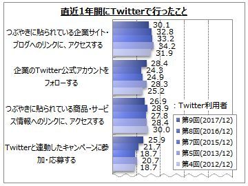 ■Tiwtter利用者が直近1年間に行ったことは、「つぶやきに貼られている企業サイト・ブログへのリンクにアクセス」「企業のTwitter公式アカウントをフォロー」「つぶやきに貼られている商品・サービスへのリンクにアクセス」「Twitterと連動したキャンペーンに参加・応募」が各3割