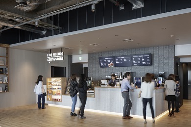 リラックスする場・仕事に集中する場など、人によって多様な使い方ができるスペースです。コーヒー等のほか、昼食時には、お弁当・サラダ・スープなど、健康的な食事の販売も行っています。カフェではスマホのおサイフサービス「LINE Pay」を利用し、スマートフォンを使った決済で買い物が可能です。また、最新のゲーム機器のほか、ビリヤードやダーツなど従業員同士のコミュニケーションを活性化させる「ゲームラウンジ」、様々な雑誌や書籍から情報収集ができる「ブックギャラリー」、LINE FRIENDSのキャラクターグッズが並ぶ「LINE FRIENDS STORE」も併設しています。