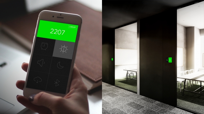 来客会議室は、LINEのスタンプを送信することで、照明・空調などをコントロールすることができるシステム(※2)を導入。社内会議室では、設置されたタブレットから、予約状況の確認をしたり、直接予約を入れたりすることができます。また、人感センサーによって、会議室が無人の場合は自動で予約がキャンセルされ、会議室が予約されているものの実際には使われていない「空予約」を減らし、効率的な運用が可能です。(※2順次導入中、画面はイメージです)