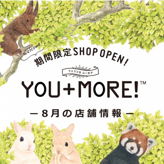 フェリシモのユーモア雑貨ブランド『YOU+MORE!』は、8月にも各地に期間限定ショップをオープンします。思わずクスッと笑顔になってしまう、うさぎ、犬、パンダ、りす、はりねずみなど動物モチーフのユーモアあふれるオリジナルアイテムが揃うショップです。首都圏は、東京ソラマチ、渋谷ヒカリエShinQs[シンクス]などに続いて、新たにルミネエスト新宿、大宮駅エキカレ、ハンズビー武蔵小杉東急スクエア店、東急ハンズ国分寺店と続々とオープンします。YOU+MORE!のウェブ通販では買えない、店舗限定の商品も販売いたします。また、先月沖縄初出店となった、東急ハンズ宜野湾コンベンションシティ店も引き続き開催中です。お近くの方は、ぜひお越しください。