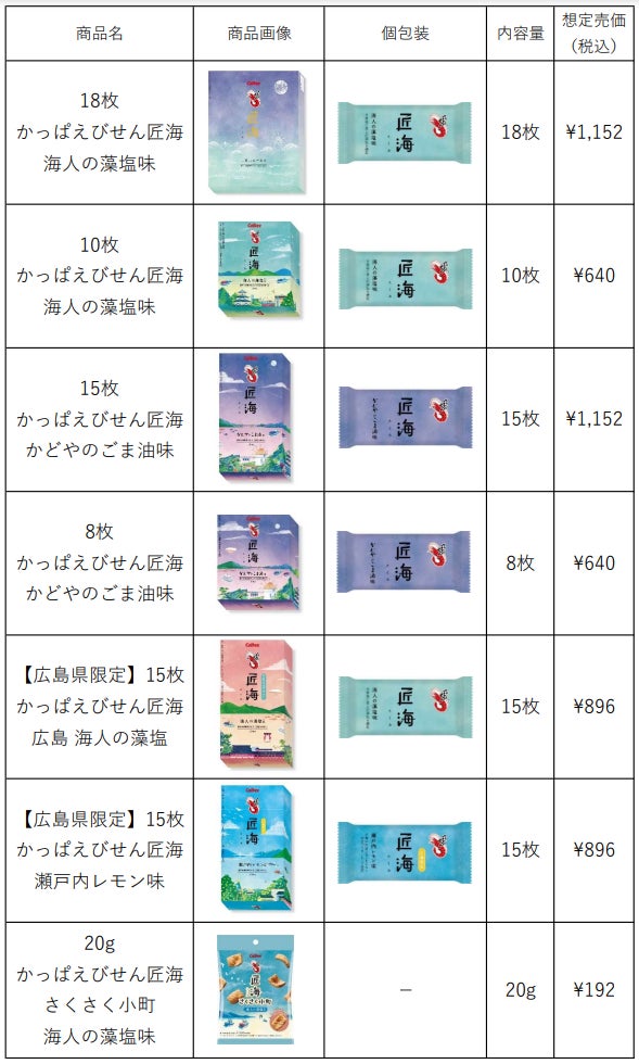 広島はカルビー創業の地であり、「かっぱえびせん」誕生の地でもあります。その特別な場所である広島でしか作れない、こだわりの「かっぱえびせん」が「かっぱえびせん匠海」です。2006年11月に発売され、その後、お土産需要の変化に合わせたリニューアルを行うなど、広島みやげの定番として成長しています。