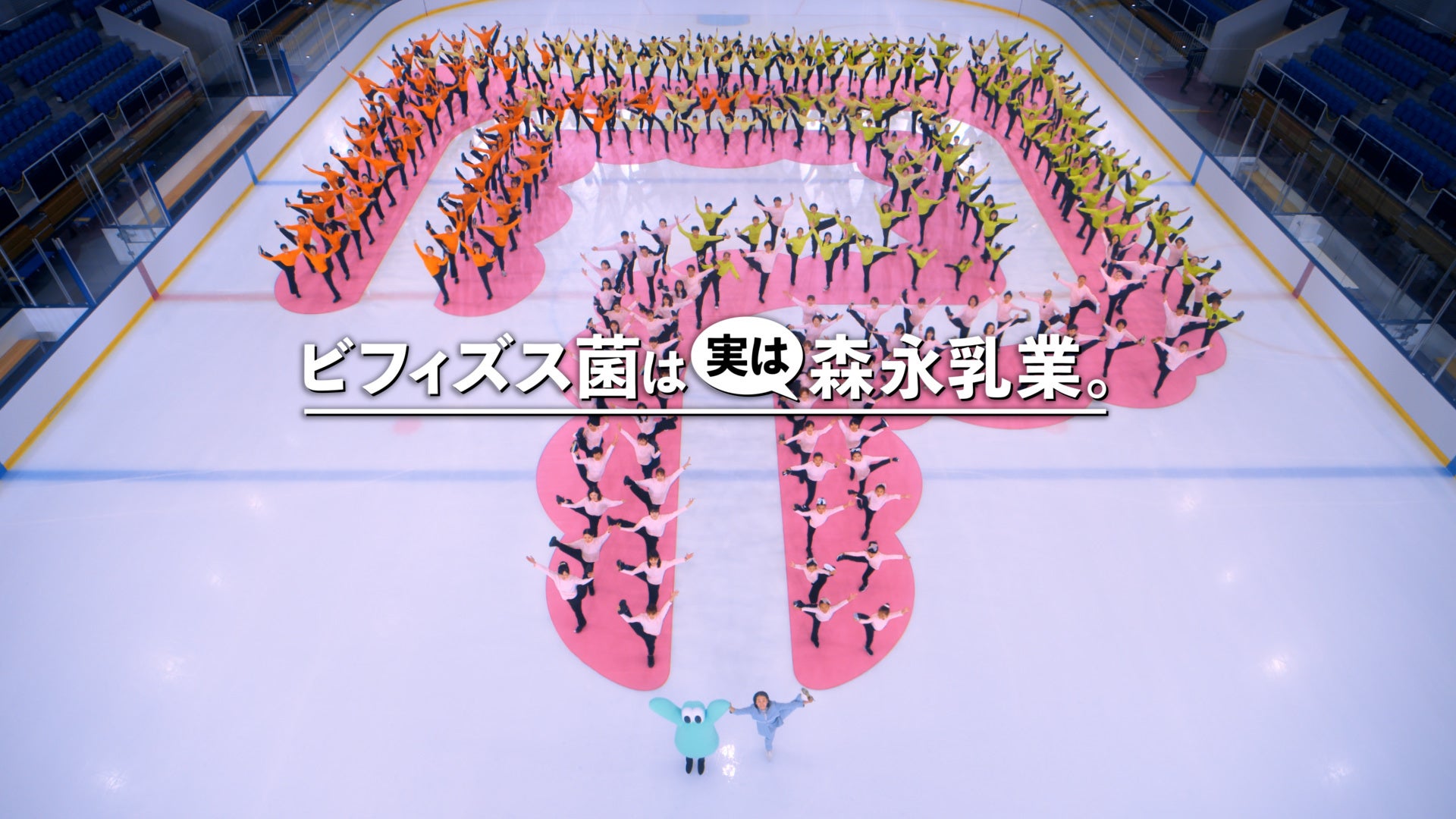 宣伝部“腸”の浅田真央さんと一般応募の方268名による、一斉“ビフィズス菌ポーズチャレンジ”です。ビフィズス菌が腸にいいことを伝えるために、一般応募者の方々は大腸の形に並んでビフィズス菌ポーズをし、その間を浅田さんにはスムーズに滑っていただきました。子供から大人までみんなが頑張ってビフィズス菌ポーズにチャレンジする姿や、とてもスムーズな浅田さんの滑りに注目ください。
